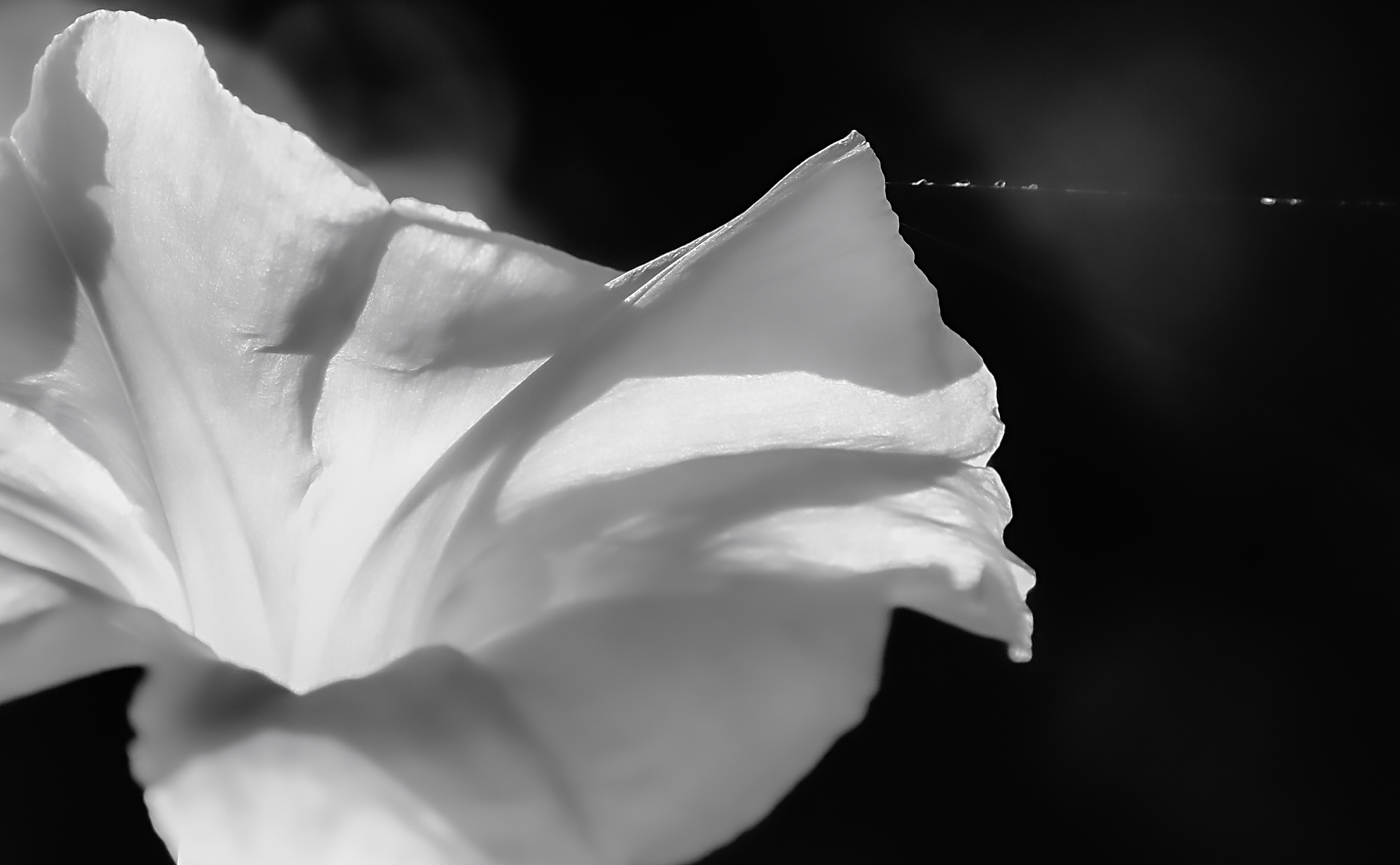 I worked on this one some time ago, trying to create an interesting black and white version. The fine line that glimmers off to the right is actually a spider web. Part of my goal was to show that off. I think it’s amazing how tiny and fragile these things are. The flower appears to be floating if you ask me. It reminds me of a clean white sheet, blowing in the wind on a clothes line. Or maybe a magic carpet.