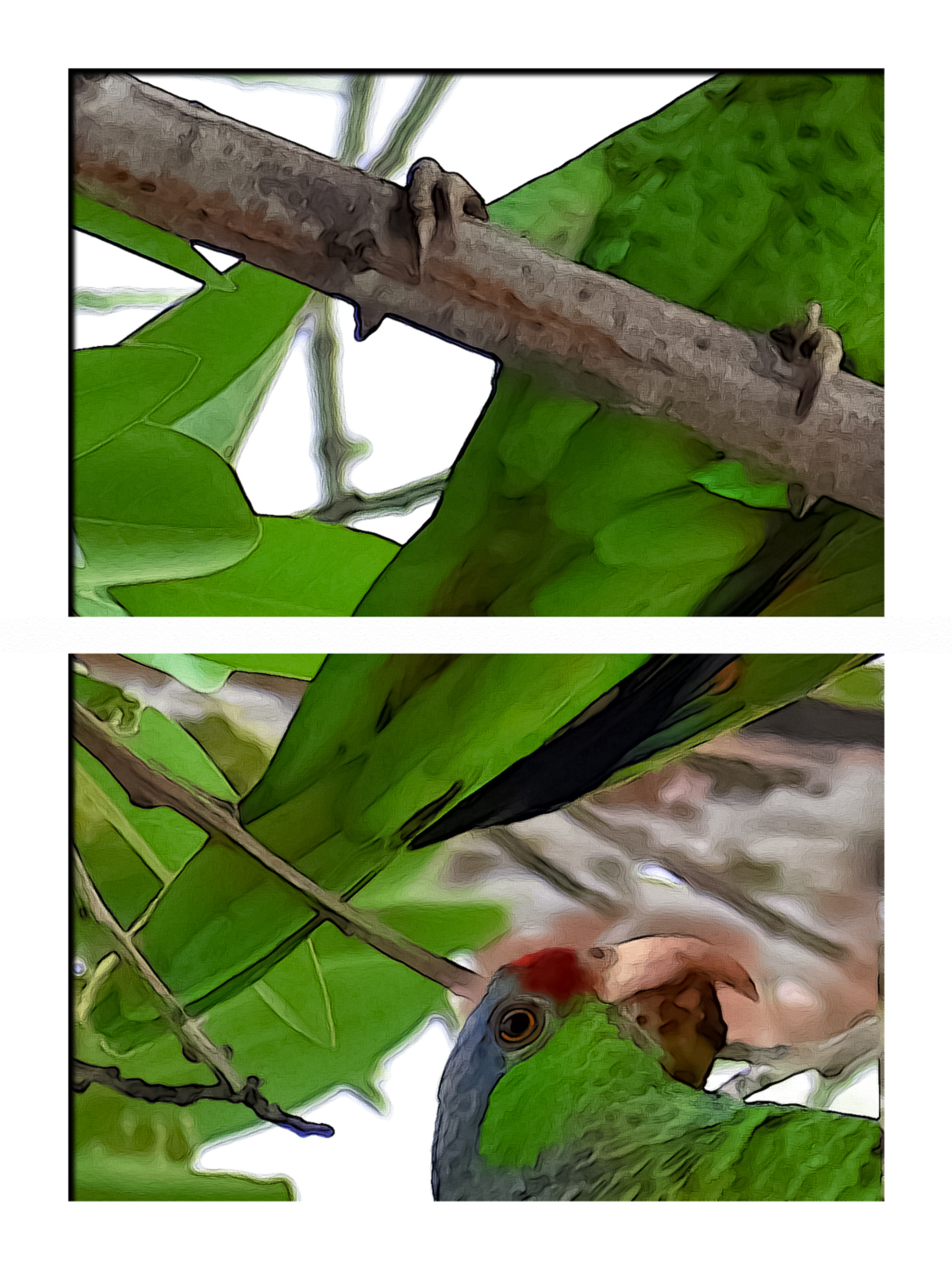 I thought it would be cool to make it look like it was drawn or hand painted. The way the parrot was sitting made it awkward, and I wanted to get a close-up of his/her claws. So… I deconstructed and reconstructed.