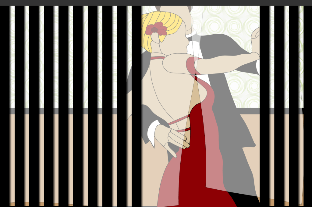 I recycled the dancers that I had made for one of my stained glass illustrator images, and added a background of wallpaper and a chair rail, some vertical blinds (or prison bars, depending on how you look at it), and a delicate sheer curtain that is threatening to blow wild in the wind. I brought up the curtain because that is actually my favorite part. It may seem silly or insignificant to anyone else, but when you are creating images in illustrator, it is OH SO rewarding to imagine—and figure out how to accomplish—new elements for your piece. I learned something new and learning is always gratifying. And I love the idea of the added sheerness, limiting our view (or perspective) even further.