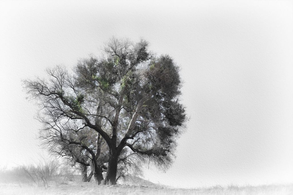 I took the photograph of the tree while hiking some months back, and the photo was bland (honestly, my eyesight is getting bad, but that’s another story). In thinking about our lives being a blank canvas, I thought that a faded black and white… with hints of color on the leaves… would be somewhat abstract and symbolic.