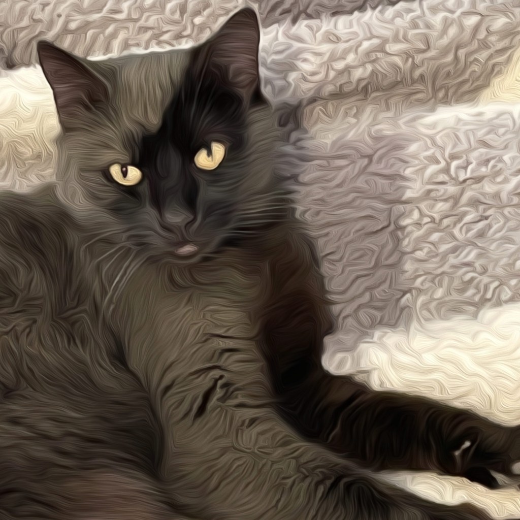 So, our cat Gypsy belongs to my son and she lives in the back unit with him. She never used to hang out in the house, but recently she discovered that my super warm Pendleton blanket is also super cozy. This was how I found her today; covered in dirt from head to paw (minus the oil paint effect that I added to tone the filth down a notch).